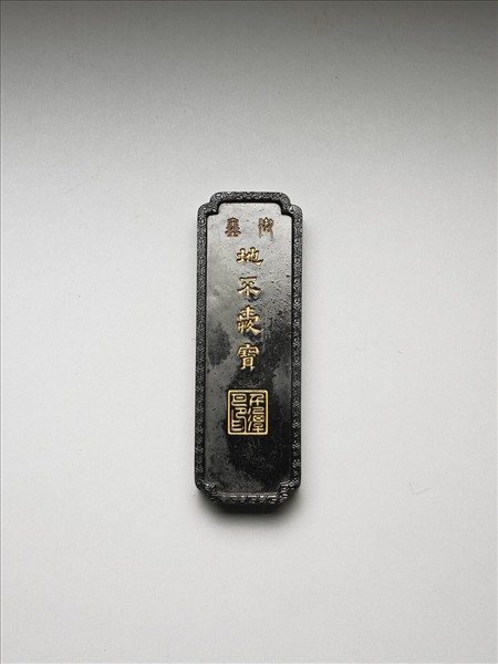 長方形墨,四角內凹,邊框起棱,棱面以六角形紋為飾。一面有填金「御墨」篆字、「地不愛寶」隸字,並模鈐「千潭月印」。另面則模印山水景色。墨側有「大清乾隆年製」楷款。此墨與其他六墨同儲於一屜。