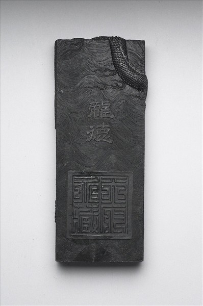 方形墨。兩墨面以水紋為地,模印二龍戲珠之圖像,龍身橫跨並突出於墨面,更添飛龍的實在感。其中一面模印隸字「龍德」,並模鈐「天府永藏」。墨側有「大清乾隆年製」、「養性殿珍藏」楷款。此墨與其他三墨同儲於一屜。