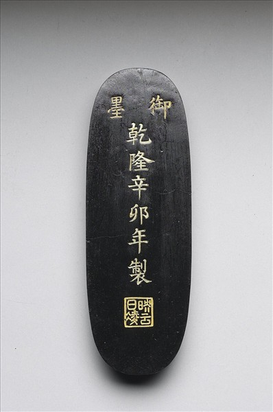 牛舌式長方形墨。一面有填金楷字「乾隆辛卯年製」、「御墨」款識,並模鈐填金「映云日凌」四字。一面模印花葉茂盛之象,左方復有竹子直起。葉片生長亦然繁茂,使墨面裝飾熱鬧而有活力。此墨與其他七墨同儲於一屜。