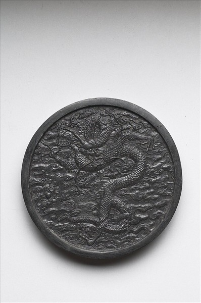 圓形墨,邊框起棱。一面模印蟠龍居中,龍珠在側,隙地滿飾雲紋。另面則有填金篆字:「御墨」,「御墨」字樣下方有一長方形開光,開光中模印「雲行雨施,萬國咸寧」八篆字。墨側有「康熙辛未年製」楷款。此墨與其他七墨同儲於一屜。