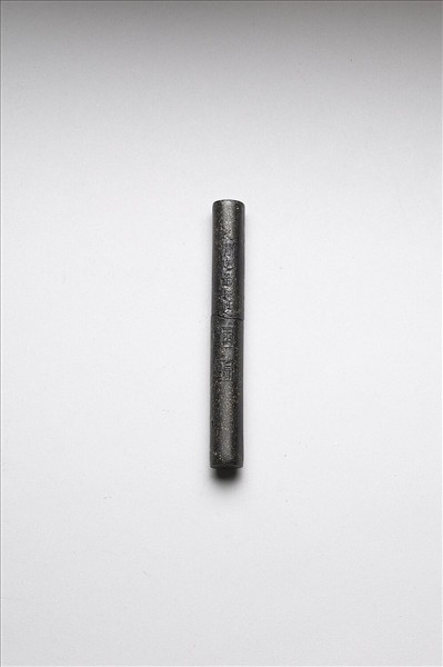 長條形圓柱墨,表面灑金為飾,面上模印楷字「大清乾隆年製」、隸字「敬勝齋珍藏」款識,並模鈐「玉質」、「金相」二印。
