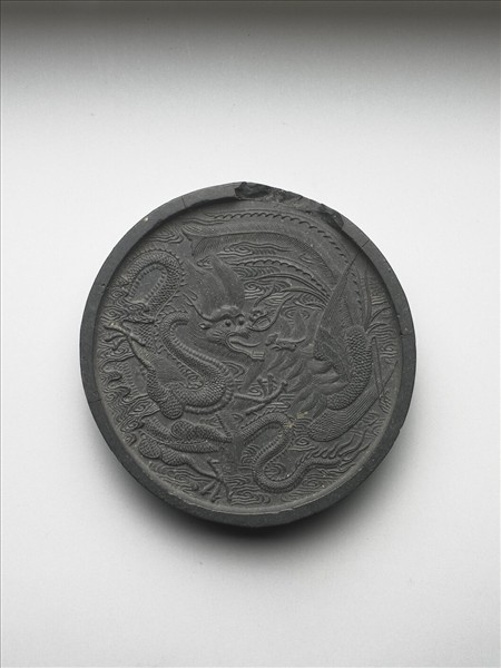 圓形墨,邊框起棱。一面模印龍鳳相對飛舞於雲間。一面則凹有長方形開光,開光中模印之「龍鳳呈祥」行書四字,應即喻指另面模印之龍鳳圖像。墨側有「程君房造」四字楷款。此墨與其他十三墨同儲於一盒。