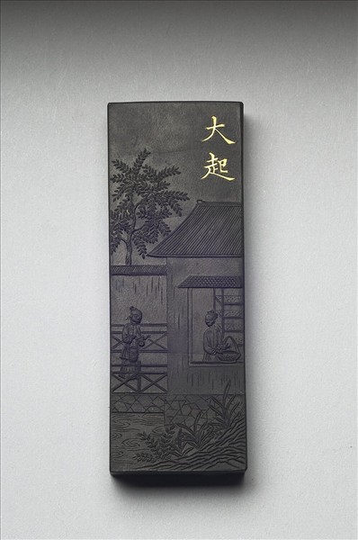 長方形墨。一面模印填金楷字「大起」,並模印屋舍庭樹,屋外有人提籃正欲進屋,屋內有一人正忙於蠶事,似正應付著蠶隻蛻皮「大起」的繁忙。另一面漱金題:「御詩。倏度三眠序,脫膚大起時,足腸盈衆箔,健食藴千絲,心已隨春老,室須向暖移,桑乾飼無歇,奚用露華滋。」御製織圖詩墨一套二十四件,共收於雙龍「御製織圖詩墨」漆盒,並有錦袱。
