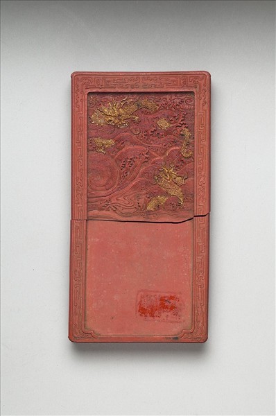 長方形硃墨,邊框起棱,棱面與墨側均模印圖案化龍紋為飾,整墨如一硯形。一面模印雙龍相戲於大海波濤,龍身漱金。一面模印乾隆御製詩文,蓋述此墨形制之由來,乃仿之於劉源所造者,另此墨面棱上有「大清乾隆年製」、「遂初堂藏墨」填金楷款。