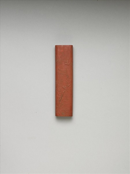 長條形硃墨。一面有填金楷字「乾隆辛卯年製」(1771)、「御墨」款識,並模鈐填金「清香直節」四字。一面模印梅花竹葉,花正盛開,又有小鳥兩隻躍飛其間,就中梅竹之象,即喻指「清香」、「直節」之意。此墨與其他十墨同儲一屜。