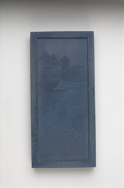畫錠為白、石青、硃砂、石綠、石黃五色,全套共十件,存放於描金雙龍嵌螺鈿「御題萬春集慶冊五色畫錠」黑漆盒,製作於嘉慶己巳年(十四年,1809) 。畫錠取材自嘉慶壬戌(七年, 1802)嘉慶皇帝題董誥〈萬春集慶〉冊,現存於本院,自〈萬戶春聲〉始,以「萬」、「春」為題名,設色山水畫共十開,每開有嘉慶御題詩。一面為填金楷書御題詩,一面則根據董誥所繪,擷取重要元素,重新構圖,模刻細膩,布局巧妙,為嘉慶時期製墨工藝之代表。