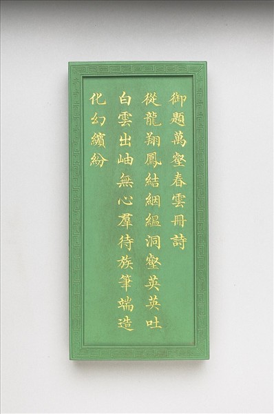 畫錠為白、石青、硃砂、石綠、石黃五色,全套共十件,存放於描金雙龍嵌螺鈿「御題萬春集慶冊五色畫錠」黑漆盒,製作於嘉慶己巳年(十四年,1809) 。畫錠取材自嘉慶壬戌(七年, 1802)嘉慶皇帝題董誥〈萬春集慶〉冊,現存於本院,自〈萬戶春聲〉始,以「萬」、「春」為題名,設色山水畫共十開,每開有嘉慶御題詩。一面為填金楷書御題詩,一面則根據董誥所繪,擷取重要元素,重新構圖,模刻細膩,布局巧妙,為嘉慶時期製墨工藝之代表。