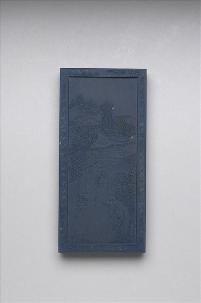 長方形藍色顏料墨,細膩鮮豔。雙面起邊框,皆飾回紋一圈,一面作填金楷書御題詩「御題萬戶春聲冊詩。九衢吉爆畼春聲,宣豫抒和庶彙萌,奮發青陽生百穀,東郊積潤恰宜耕。」另一面模印民家巷弄中,童子數人燃鞭炮嬉樂。五色畫錠一套十件,共收於雙龍嵌螺甸「御題萬春集慶冊五色畫錠」漆盒,並有錦袱。