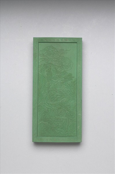 長方形綠色顏料墨,細膩鮮豔。雙面起邊框,皆飾回紋一圈,一面作填金楷書御題詩「御題萬壑春雲冊詩。從龍翔鳳結絪緼,洞壑英英吐白雲,出岫無心羣待族,筆端造化幻繽紛。」另一面模印奇石幻山間,勁松挺立朵雲繚繞。墨兩側各有陽文楷款「嘉慶己巳年製」、「臣董教增恭錄」。五色畫錠一套十件,共收於雙龍嵌螺甸「御題萬春集慶冊五色畫錠」漆盒,並有錦袱。