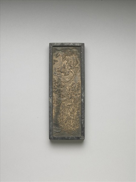 長方形墨,周起邊框,面有些微霉點。一面模印八仙於深山蒼松間,其上有仙人童子端坐雲朵上。另一面刻陽文「世寶」,下鈐「詹雲鵬藏」篆印。墨側有陽文楷款「玄初監製」。與另三件舊墨共儲一屜。