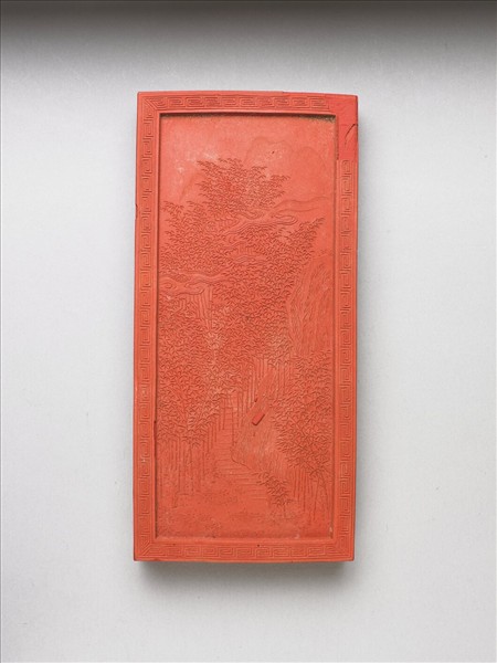 長方形硃砂顏料墨,細膩鮮豔,邊角微有剝損。雙面起邊框,皆飾回紋一圈,一面作填金楷書御題詩「御題萬竿春玉冊詩。淨植猗猗幾萬竿,調融粉墨寫檀欒,描摹遠勝蕭郎筆,應識胸中千畝寬。」另一面模印竹林山景,台階小徑向上延伸至雲霧裊裊處。五色畫錠一套十件,共收於雙龍嵌螺甸「御題萬春集慶冊五色畫錠」漆盒,並有錦袱。