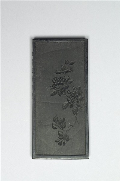 長方形墨,邊框起棱。一面有填金隸書乾隆詩作:「御詠櫻桃花。素英如雪著枝繁,轉眼珊瑚珠可捫,卻笑風流裴僕射,雨晴履跡繞南園。」一面模印櫻桃花一枝由右側伸出,花作盛開之狀。墨側有「大清乾隆年製」楷款。是墨與其他四十七塊同儲一盒,為成套之乾隆御製花卉詩套墨。