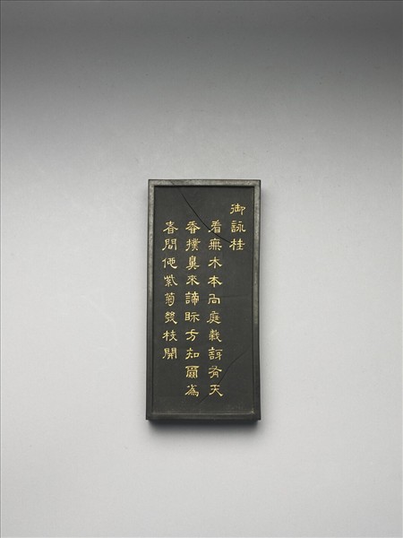 長方形墨,邊框起棱。一面有填金隸書乾隆詩作:「御詠桂。看無木本向庭栽,訝有天香撲鼻來,諦視方知爾為者,間他紫菊幾枝開。」一面模印桂花為飾,花葉繁茂。墨側有「大清乾隆年製」楷款。是墨與其他四十七塊同儲一盒,為成套之乾隆御製花卉詩套墨。