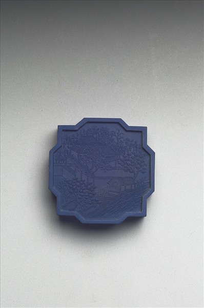 多邊幾何形藍色墨,邊框起棱,外廓如正八角形與正方形上下疊合所成。一面有填金楷書乾隆詩作:「御製南屏晚鐘,庚子(1780)。幾暇搜冥對硯屏,霜鐘送響一聲聲,鬢霜已改十年貌,醒耳清音卒未更。」另一面則模印屋舍景觀,據乾隆詩作可知該圖為描繪西湖名景「南屏晚鐘」者。墨側有「乾隆年製」楷款。此墨與其他九塊色墨各自表現西湖一景,而成一套「西湖十景」套墨,俱同儲於一盒。