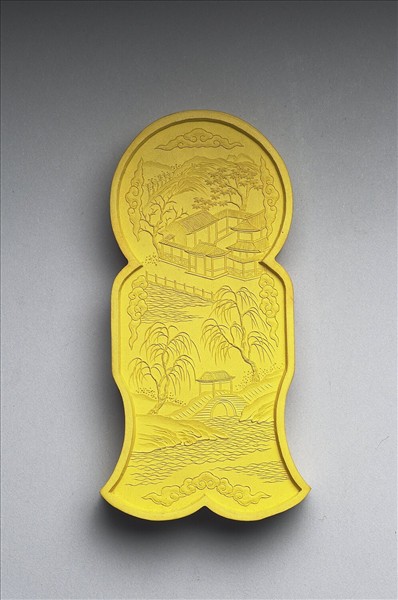 幾何形黃色墨,邊框起棱,外廓如一圓與雙魚符相接而成。一面有填金楷書乾隆詩作:「御製花港觀魚,庚子(1780)。惠莊空論知與否,魚樂由來在港花,大輅椎輪原即此,玉泉踵事笑增華。」另一面則模印屋舍景觀,據乾隆詩作可知該圖為描繪西湖名景「花港觀魚」者。墨側有「乾隆年製」楷款。此墨與其他九塊色墨各自表現西湖一景,而成一套「西湖十景」套墨,俱同儲於一盒。