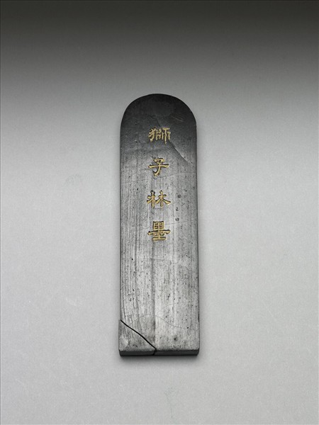 碑碣形墨。一面填金隸書「獅子林墨」,另一面刻填金御製詩「御製題橫碧軒。溪水軒前凍尚凝,一般碧色鏡光澄,漫於虛實閒評度,且喜雖風波不興。」側有陽文墨款「乾隆辛丑年製」。此乃乾隆題文園獅子林十六景詠景詩,二套共三十二件,儲於「螺劑含輝」雕花木盒。