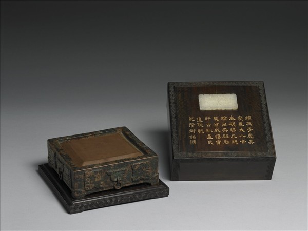 硯,四方形,硯面外圍凹下一圈為硯池,周棱飾方回紋。側壁每面飾左右相向淺浮雕側身變形龍紋,其間飾鋪首紋,獸鼻突成一半環,下帶一活環為飾。四矮足,硯背外圈突起一寬棱,其內先淺凹一圈,中央深凹成一方槽;淺凹之圈陰刻清乾隆皇帝楷書銘。中央方槽內陰刻隸書三行六字:「大清乾隆仿古」。帶嵌玉木盒。這件澄泥石渠硯就是採用汾河中的細泥,送至蘇州一帶燒製而成,形制則是仿自當時內府所藏的一方「唐石渠硯」。