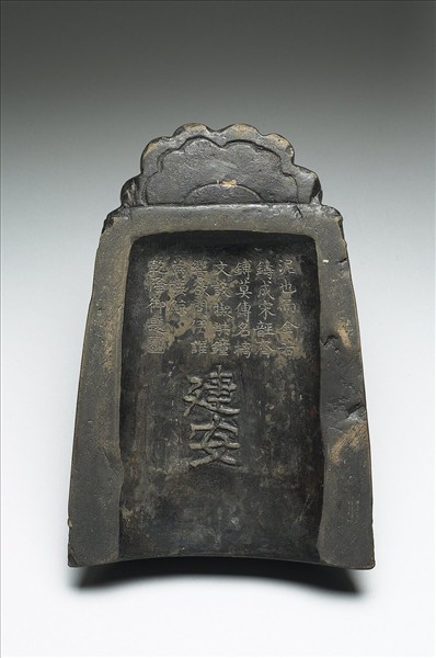 硯仿古銅器鍾形,硯色紫中泛黑、硯面受墨處,為鐘體平整處,其上方為墨池,墨池作長方形,墨池有二弦紋,弦紋之間,浮雕旋渦紋八,隙地以波浪紋為飾,硯額為鐘紐,其上浮雕臥蠶紋三,中央有凹孔,硯下方亦以二弦紋相框,中央浮雕三朵團花,隙地以蒲蓆紋為飾,覆手穹起,中央凸雕「建安」楷書二字,其上鐫清高宗御製詩乙首,楷書:「泥也而金若鑄成,宋齊鏄莫傳名,摛文設擬洪鍾響,欲問伊誰為發鯨」、款題:「乾隆御題」,有鈐印一:曰「比德」