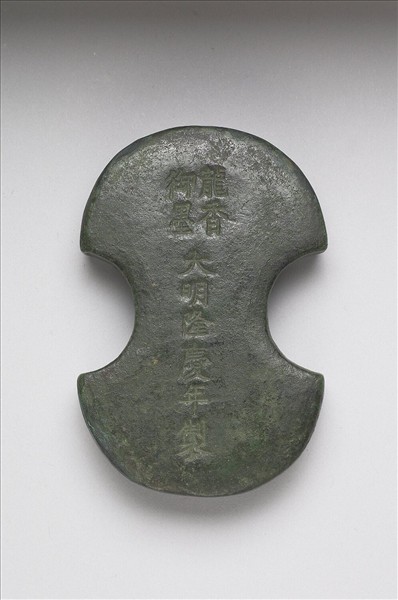 墨綠色顏料墨,銀碇形。一面磨損嚴重圖案幾不可見,惟識有邊框與些微漱金。另一面平素,雙行直書「龍香御墨」。與另三件明墨共收於貼「方于魯墨」籤條錦盒中。