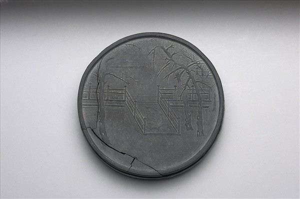 圓形墨,周起棱,面稍有霉斑,一角裂成三塊。一面光素,陰刻篆款「鳥跡書臺」,另一面作庭園與露台,台上隱有鳥踏足跡。墨側有陽文楷款「程君房監造」。底襯同形墊布。本樣一式五件共收於雕八吉祥漆盒中。