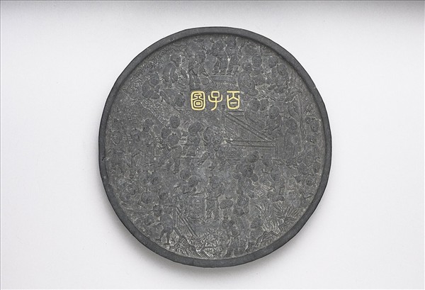 圓形墨,周起棱,邊角破損。雙面皆模印百子圖,描繪眾小童於庭院或水邊嬉戲,動作表情生動,神態各異,熱鬧活潑,其中一面有戧金篆書「百子圖」。墨側有陽文款「萬曆丙午年造」(1606)。