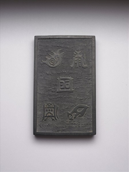 長方形墨,周起邊框。一面模印以波濤紋為地,上飾五嶽真形圖。另一面刻題銘「掩關弄柔翰,天遊寄寥廓,遠固歷十洲,近亦探五嶽,豹囊啟玄霜,真形資領畧,邈矣玄黃判,紛若書契作,洞觀卑萬仞,固志耽一壑,守默返吾真,寫懷聊獨樂,佳興毛穎傳,雲霞剡藤落,謝彼無言公,解我文字縛,何時畢婚嫁,還期等汙皭,芥可納須彌,嶽應儕毫末,畢竟水煙空,假合膏火鑠,觀化齊有無,豁然發一噱。朱之蕃元介甫題」。墨側各有陽文楷書「大國香」`、「君房聘袞監製」。頂側款「萬曆壬寅程幼博墨」(三十年,1602)。