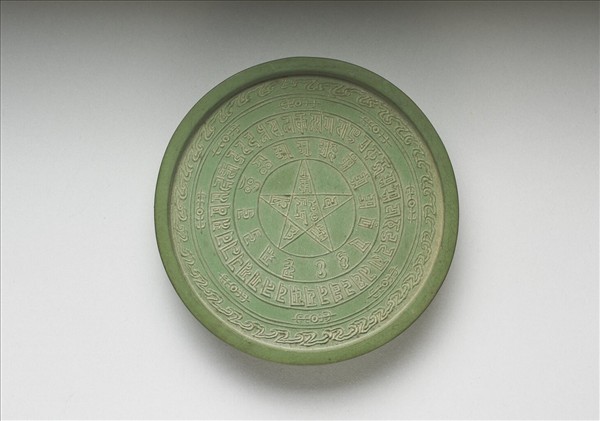 綠色顏料墨,圓形,邊框起棱。墨一面陰文隸書「金剛法輪」四字,描銀並加長方形框。另一面書多圈梵文與法輪紋飾,周飾雲紋。墨側分有陽文楷款「大藏寫經之墨」、「方于魯監製」。寫經墨一式五色(故文1048-故文1052),共儲於一木盒中。