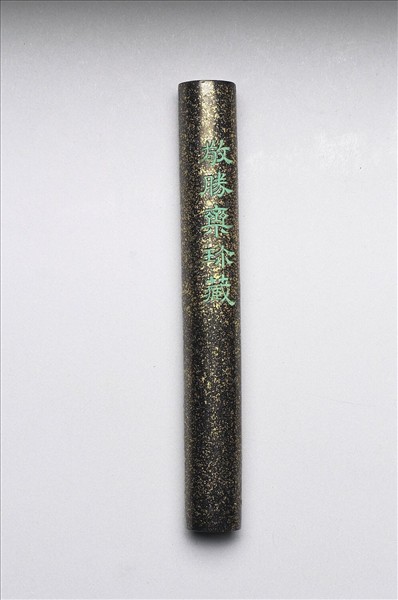 長條形圓柱墨,表面灑金為飾,面上模印楷字「大清乾隆年製」、填綠彩隸字「敬勝齋珍藏」款識,並模鈐「玉質」、「金相」二印。此墨與其他三墨同儲於一盒。