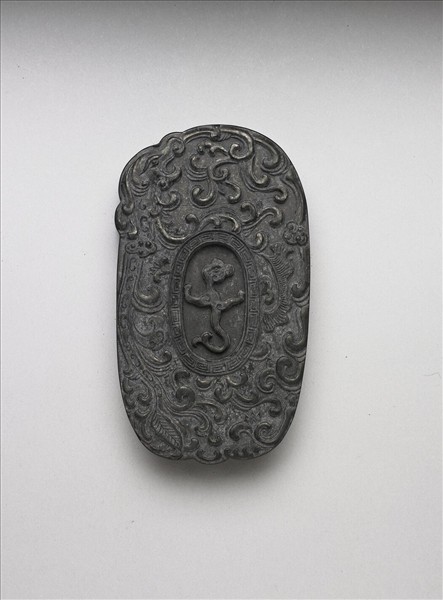 黑墨,近橢圓而類玉佩之形。兩面皆模印一龍飛繞於雲間,墨面中央有一橢圓形開光,開光中皆有一小龍子。墨側有「大清乾隆年製」、「御墨」填金款識。此墨與其他三墨同儲於一盒。