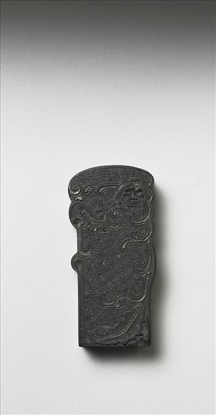 圓首碑碣形墨。墨之兩面均以卍字紋為地,上有一龍,惟龍身簡省離散如雲紋,墨面下方模印蕉葉為飾。墨側有「大清乾隆年製」、「御墨」填金款識。此墨與其他九墨同儲於一盒。