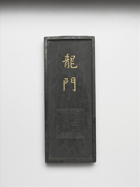 長方形墨,邊框起棱。一面有填金行楷書「龍門」,該字下方有方形開光,開光中模鈐「程氏珍藏」四字。另面則模印一魚躍出水面,水右上方有山壁崖樹,應是表現「鯉躍龍門」之象,正與另面之「龍門」二字相呼應。此墨與其他三墨同儲一盒。