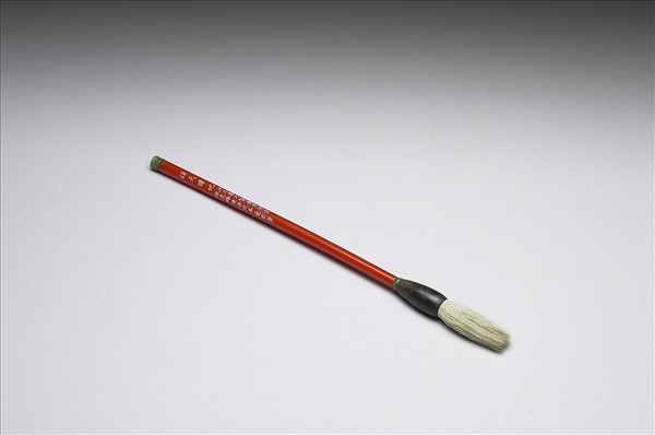 羊豪筆,紅色細長筆桿,上有「經天緯地」、「丙辰春月賀蓮青精製嫩長鋒陳淨純羊豪對筆」(咸豐六年,1856)款識,具述此筆之材質與製作者。筆桿前後各鑲碧綠色料,下接獸角質筆管,鋒長而白,應是書寫篆隸的佳器。