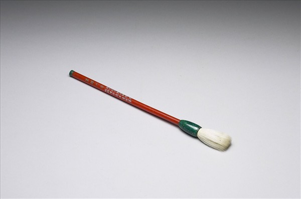 羊毫筆,紅色細長筆桿,上有「篆隸之筆」、「丙辰秋月戴月軒精製嫩長鋒陳淨宿羊毫對筆」(咸豐六年,1856)款識,具述此筆之材質與製作者。筆桿前後各鑲碧綠色料,下接碧綠料筆管,鋒長而白,應是書寫篆隸的佳器。