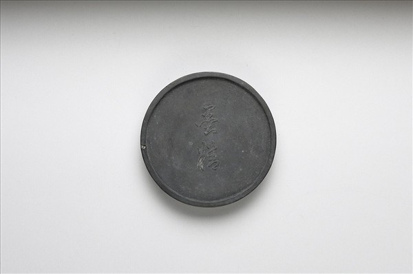圓形墨,周起棱,邊稍破損面有霉點。一面模印一文臣雙手持笏,另一面刻陽文行書「墨精」二字。墨側有陽文款「方于魯製」。本件與其他五墨共收一屜,藏在蒔繪花卉紋木盒中。