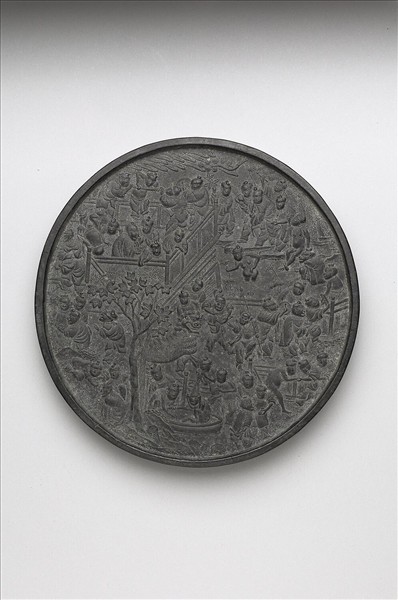 圓墨,模印庭園中嬉戲的幼兒們,嬰戲的題材在宋代已流行,明代更為普遍。百子圖墨在明、清十分常見,尹潤生《墨林史話》所收有十二件之多。根據墨側的款識,此墨乃出自程君房之手。程君房以擅製墨聞名,與方于魯爭名,遍訪名士求取題贊,並倩名匠版刻,輯《程氏墨苑》十二卷。《程氏墨苑》與《方氏墨譜》的刊印,無疑提供非常方便的模刻取樣,促成圖樣的流行。