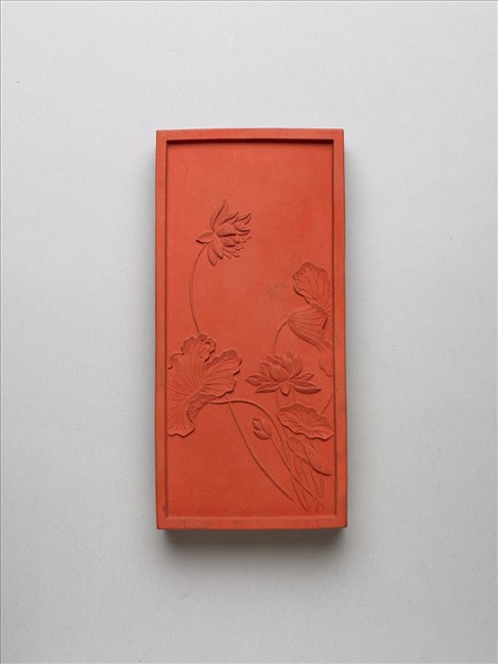 長方形硃墨,邊框起棱。一面有填金隸書乾隆詩作:「御詠荷。鯉魚風動柄柶搖,破葉?華勢若飄,卻是色香真淨處,水天了了照清寥。」一面模印荷花荷葉為飾,其中荷花三朵,兩朵盛開,一朵含苞,荷葉張展翻折,各具姿態。是墨與其他二十四塊同儲一盒,為成套之御製花卉詩套墨。