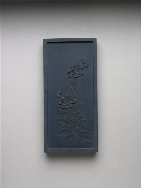 長方形藍色墨,邊框起棱。一面有填金隸書乾隆詩作:「御詠罌粟。開到米囊春欲殘,不供實用祇供觀,笑他罌裏雖盛粟,那與貧人作一餐。」一面模印嬰粟花兩枝,葉片繁茂,其上有兩朵盛開嬰粟花。是墨與其他二十四塊同儲一盒,為成套之御製花卉詩套墨。