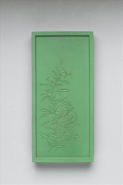 長方形綠色墨,邊框起棱。一面有填金隸書乾隆詩作:「御詠石竹。石側㛹娟致冶幽,有枝有葉卻非脩,不於霜後看稜節,五色應迷王子猷。」一面模印石竹兩枝由右下伸出,花葉繁茂,作盛開之狀。是墨與其他二十四塊同儲一盒,為成套之御製花卉詩套墨。