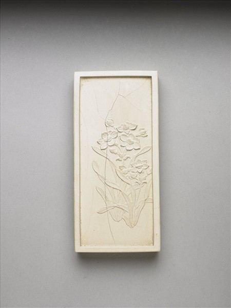 長方形白色墨,邊框起棱。一面有填金隸書乾隆詩作:「御詠水仙。心鏤黃金瓣裁玉,玉金豈足累清高,傳神若問誰稱最,八斗唯應子建曹。」一面模印水仙兩株,花作盛開之貌。是墨與其他二十四塊同儲一盒,為成套之御製花卉詩套墨。