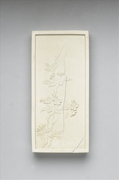 長方形白色墨,邊框起棱。一面有填金隸書乾隆詩作:「御詠梨花。喜白為姿懶著紅,傳根疑是水晶宮,十分靚豔曾何礙,饒有一般林下風。」一面模印梨花兩枝由左下伸出,花葉繁茂,作盛開之狀。是墨與其他二十四塊同儲一盒,為成套之御製花卉詩套墨。