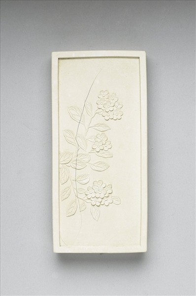 長方形白色墨,邊框起棱。一面有填金隸書乾隆詩作:「御詠繡毬花。幾度江南見花朵,祇疑枝上雪攢球,玲瓏簇就煙霞體,點綴真宜山水州。」一面模印繡毬花兩枝由左側伸出,花葉繁茂,作盛開之狀。是墨與其他二十四塊同儲一盒,為成套之御製花卉詩套墨。