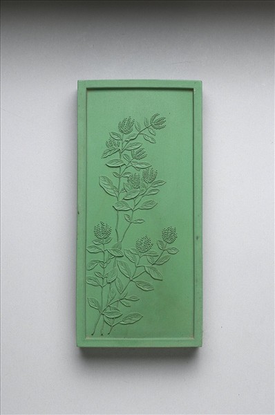長方形綠色墨,邊框起棱。一面有填金隸書乾隆詩作:「御詠珍珠蘭。垂垂黃穗擬珠珍,薰茗烹湯香滿脣,花譜卻稱色正紫,從知記載信誰真。」一面模印珍珠蘭三枝由左下伸出,花葉繁茂,作盛開之狀。是墨與其他二十四塊同儲一盒,為成套之御製花卉詩套墨。