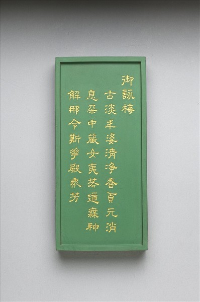 長方形綠色墨,邊框起棱。一面有填金隸書乾隆詩作:「御詠梅。古淡丰姿清淨香,貞元消息朵中藏,女夷若道無神解,那令斯華殿眾芳。」一面模印梅花一枝,枝幹彎折,作盛開之狀。是墨與其他二十四塊同儲一盒,為成套之御製花卉詩套墨。