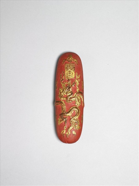硃砂顏料墨,牛舌狀,器面戧金多但已模糊。雙面皆浮雕戧金龍紋與雲紋,一面首處有金地陽文篆款「萬曆」,另一面作「赤玉」。本金款一式四件,並與另四件綠、棕色墨合儲一漆盒。