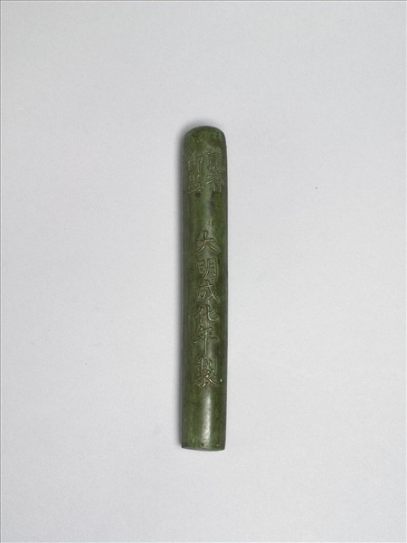 綠色顏料墨,圓柱狀。一面浮雕龍戲珠紋,另一面直行楷款「大明成化年製」,上有「龍香御墨」雙行四字款,紋飾與款原皆有描金,已多脫落。本屜有綠與棕色圓柱狀及牛舌狀墨各二,與另四件硃砂「赤玉墨」合儲一漆盒。