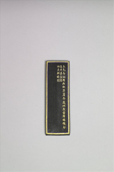 長方形墨。一面浮雕練染圖,有填金隸款「練染」,另一面作填金回紋邊框,加塗藍色一周,內有填金行書練染詩並記,詩云「五色無論精與粗,茅簷卒歲此殷需,布棉題句廑民瘼,敬纘神堯耕織圖」。墨側陽文楷款「江南織造奴才增崇恭呈」。棉花圖墨乃描繪棉花從佈種到織布的工序圖。