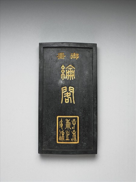 長方形墨,面有些微霉點。一面光素,僅填金陰文:「御墨」、「綸閣」及「子子孫孫用之協相」。一面則為臺閣景,大致構圖與明代程、方墨譜同名之墨圖相似,唯局部更細膩。綸閣是天子綸旨制誥的起案處。墨側陽文銘款「乾隆丙申年製」(四十一年,1776)。
