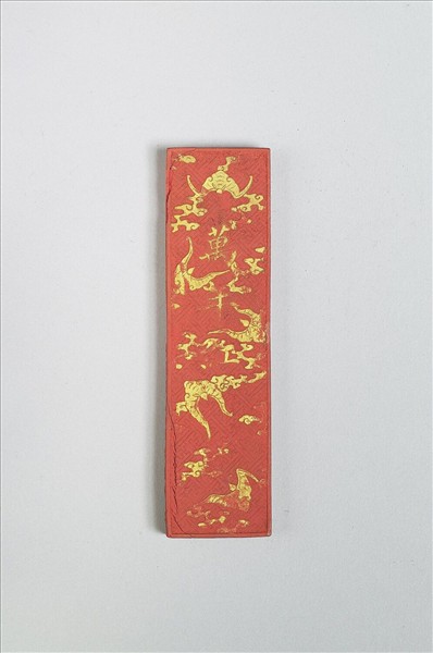 硃砂顏料墨,長方形,周微有棱,面有些微損傷,金漆略駁。雙面皆模印工形錦紋為地,上有漱金雲紋與蝙蝠,一面尚填金字「萬年紅」。墨側一面有陽文款「光緒九年」,另一側款「安徽巡撫奴才裕祿恭進」。