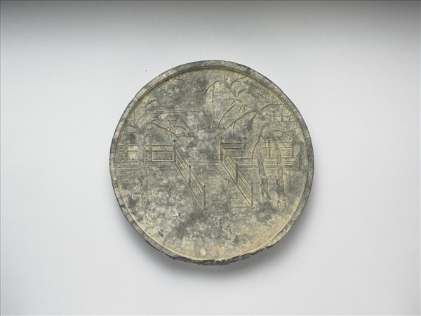 圓形墨,周起棱,周緣稍有損傷,霉斑嚴重。一面光素,唯陰刻篆款「鳥跡書臺」,另一面作庭園與露台,台上隱有鳥踏足跡。墨側有陽文楷款「程君房監造」。