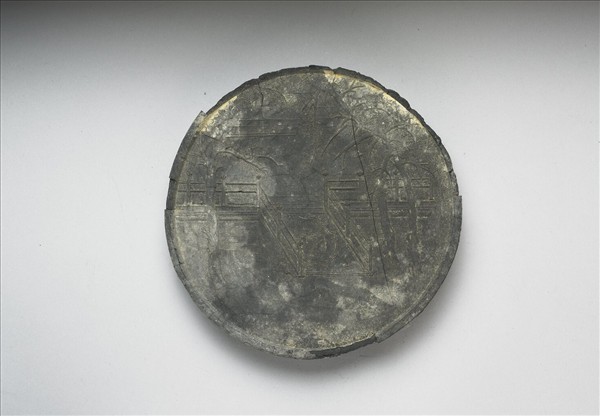 圓形墨,周起棱,周緣有損傷剝落,霉斑嚴重。一面光素,唯陰刻篆款「鳥跡書臺」,款漱金並有藍色框,另一面作庭園與露台,台上隱有鳥踏足跡。墨側有陽文楷款「○○房監造(○○剝落不可見,應為程君)」。